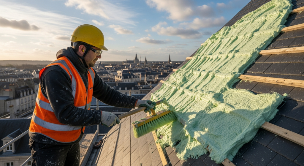 Le climat sarthois impose d’intervenir idéalement au printemps ou à l’automne. Il faut impérativement une fenêtre météo de 3 jours sans pluie (pour que le produit ne soit pas rincé immédiatement), sans grand vent (pour la sécurité et la précision de la pulvérisation) et surtout sans gel, ce qui pourrait faire éclater les tuiles humides lors du traitement.