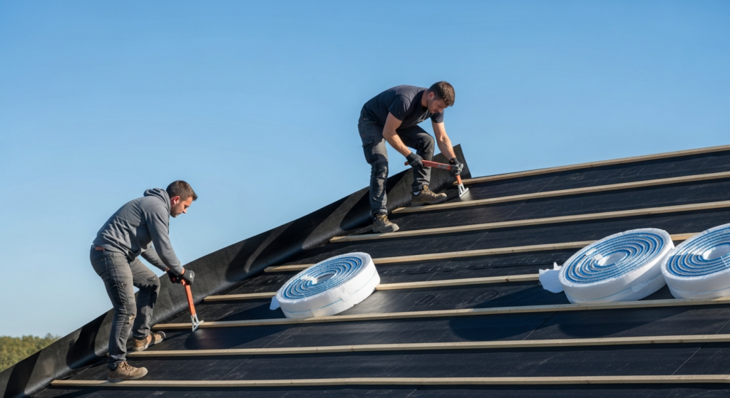 - La pose à froid (EPDM) : Une membrane en caoutchouc synthétique monocouche, extrêmement résistante, qui ne nécessite pas de flamme sur le chantier, réduisant ainsi les risques d’incendie sur les charpentes bois.