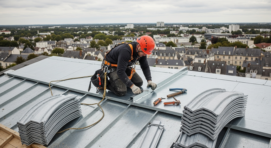 - Le matériau : L’ardoise naturelle d’Angers demande une technique de pose différente et un coût matière supérieur à la tuile terre cuite mécanique classique.
